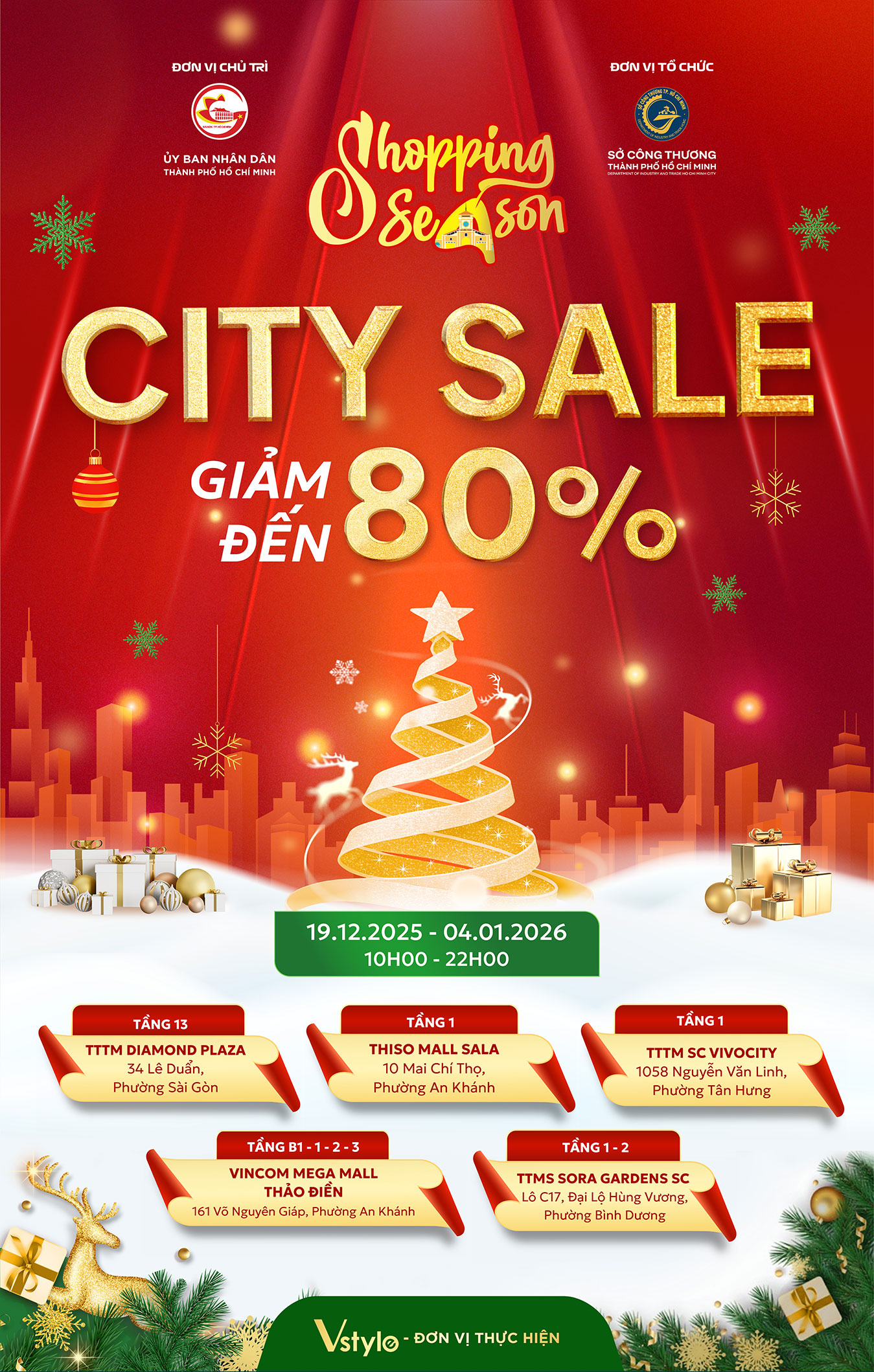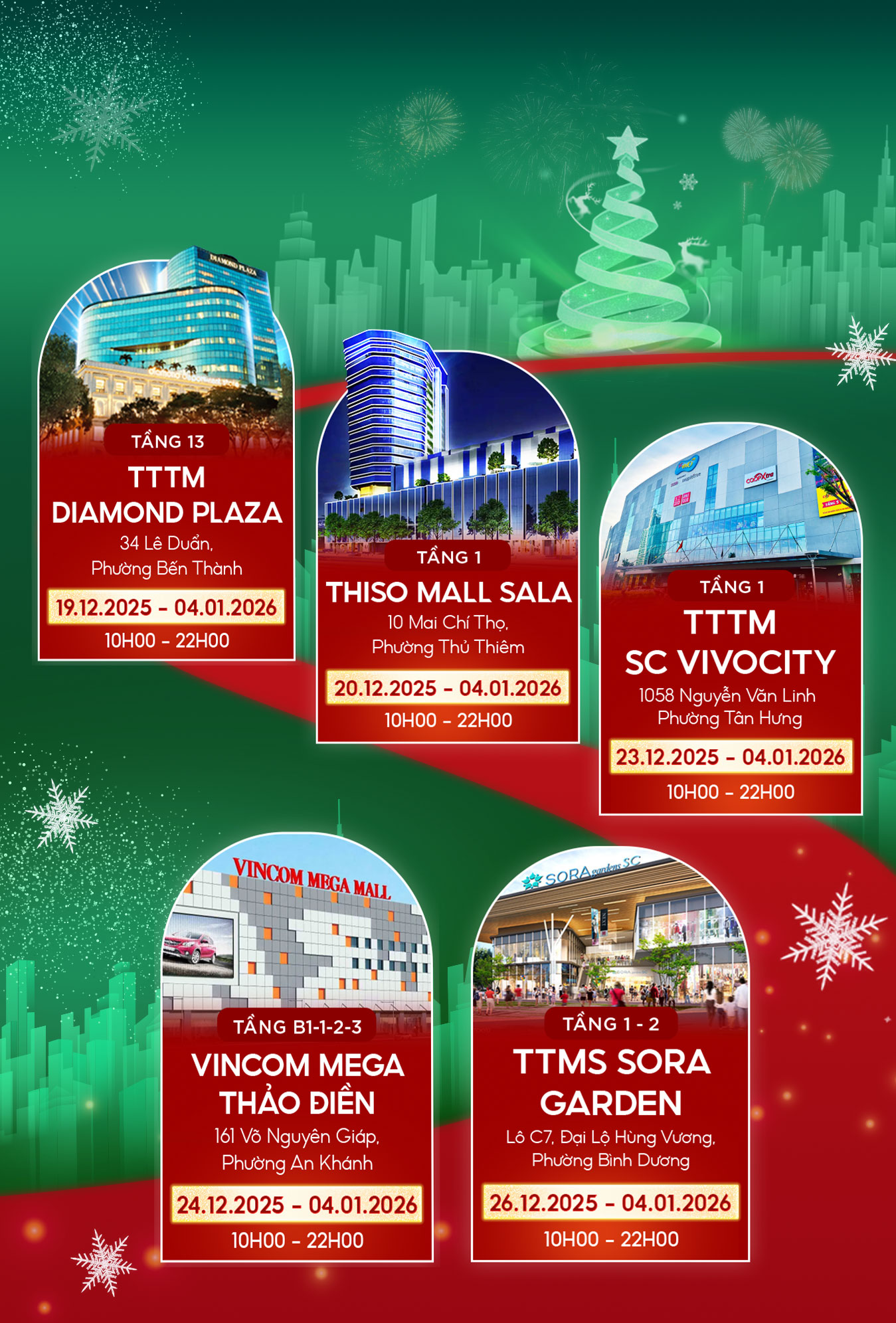 TTTM DIAMOND PLAZA: 34 Lê Duẫn, Phường Bến Thành (Từ 19.12.2025 đến 04.01.2026) TTTM THISO MALL SALA: 10 Mai Chí Thọ, Phường Thủ Thiêm (Từ 20.12.2025 đến 04.01.2026) TTTM SC VIVOCITY: 1058 Nguyễn Văn Linh, Phường Tân Hưng (Từ 23.12.2025 đến 04.01.2026)
